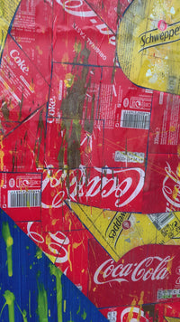 Création du sigle de Superman à partir de cannettes de Schweppes et coca cola découpées à la cisaille puis collées. Fond fait à partir de peinture acrylique et de photocopies de planches de comics collées puis déchirées. De quoi apporter une touche de peps dans son intérieur et de se lever tous les matins dans la peau d'un super héro ;-)